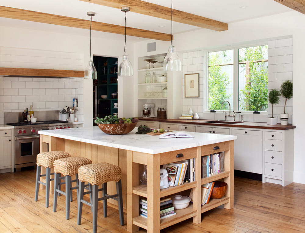 The clean white cabinets and classic white sink make the space feel large but the butchers block countertops and burnished silver drawer pulls give the whole look a rustic flair. Shop these products now. By adding other elements like stone or brick and exposed beams.
